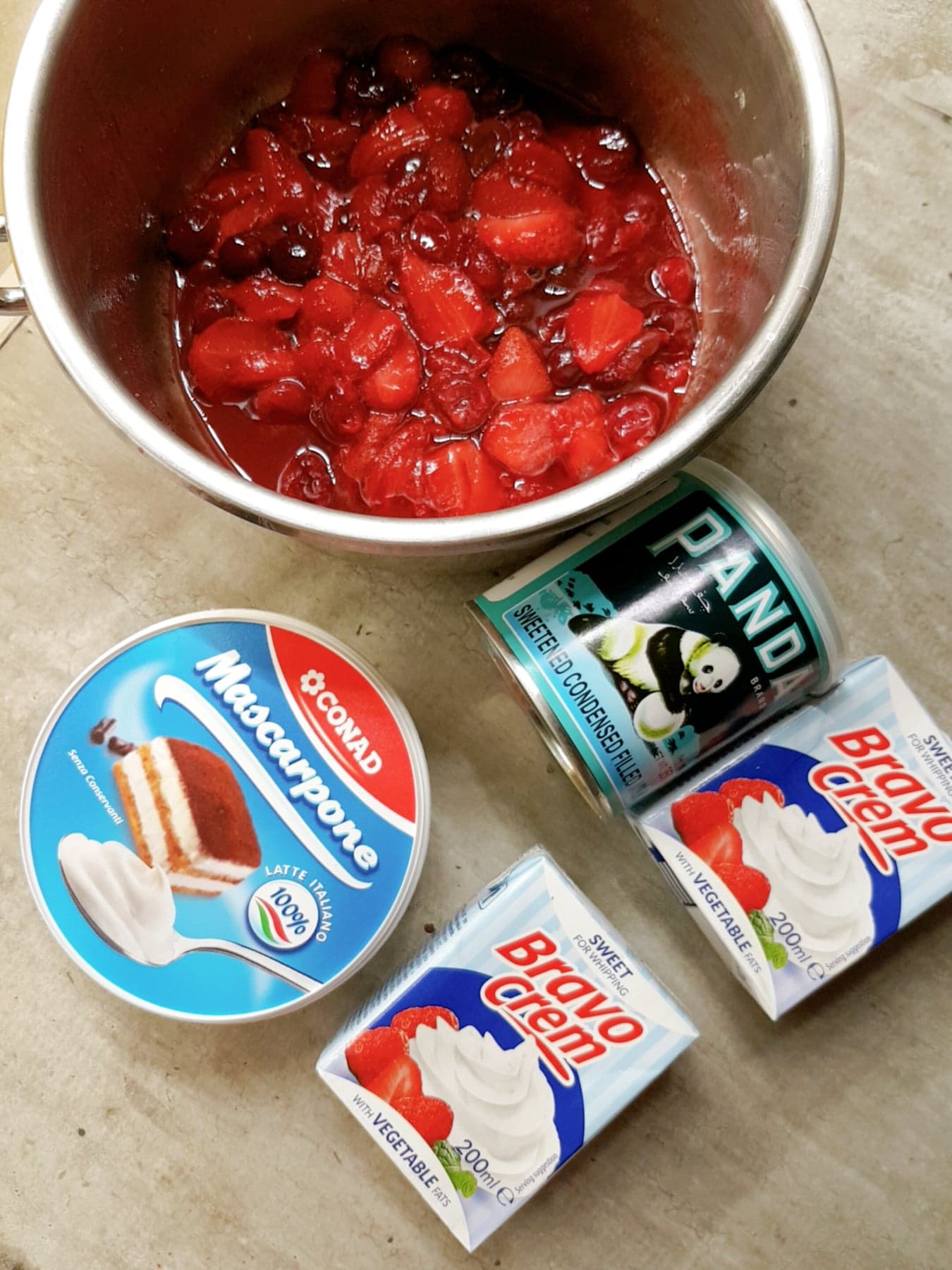 Hapi i dytë është përgatitja e kremit duke rrahur fillimisht panën e ëmbël, por jo shumë të fortë sa të mpikset. Më pas i shtoni qumështin e kondesuar. Unë i shtova 1 lugë gjelle si në foto, por ju mund ti shtoni disa të tilla në varësi të ëmbëlsisë që dëshironi. Ne i duam gjerat me ëmbëlsi të moderuar dhe ndaj bëjmë shumë kujdes kur hedhim sheqerin (se na I lë familja pa ngrënë hahaha). Në fund i shtojmë kremin mascarpone dhe vijojmë më rrahjen me rrahësin elektrik dhe për 1 minutë.